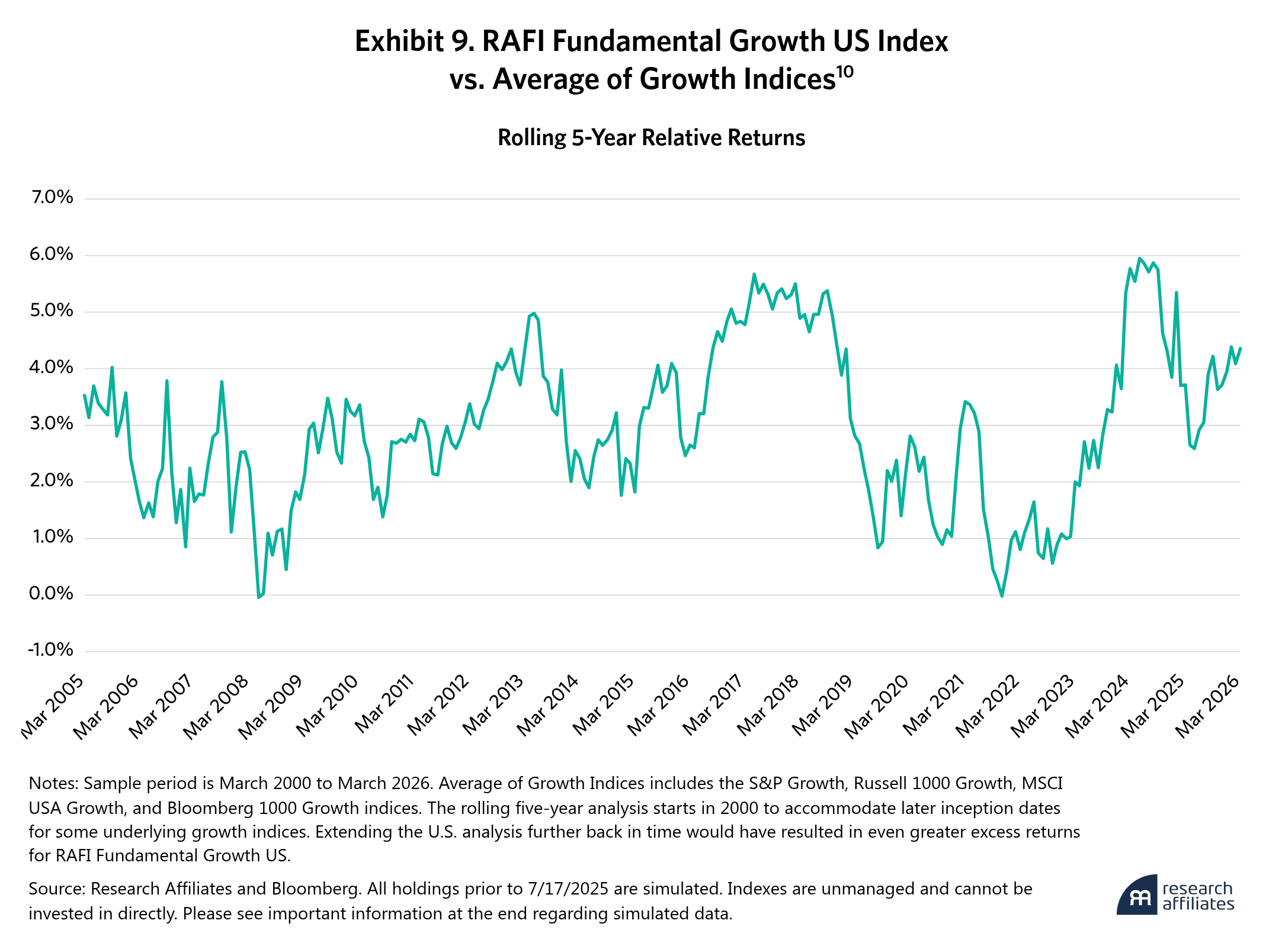 | Notes: Sample period is March 2000 to March 2026. Average of Growth Indices includes the S&P Growth, Russell 1000 Growth, MSCI USA Growth, and Bloomberg 1000 Growth indices. The rolling five-year analysis starts in 2000 to accommodate later inception dates for some underlying growth indices. Extending the U.S. analysis further back in time would have resulted in even greater excess returns for RAFI Fundamental Growth US. Source: Research Affiliates and Bloomberg. All holdings prior to 7/17/2025 are simulated. Indexes are unmanaged and cannot be invested in directly. Please see important information at the end regarding simulated data. |